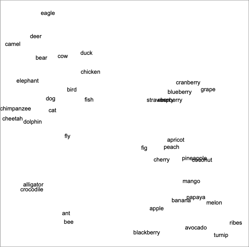 예를 들어 단어 임베딩을 일종의 "의미 공간"에 단어를 배치하려고 시도하는 것으로 생각할 수 있습니다 . 단어는 임베딩에서 근처에 나타납니다. 예를 들어 ChatGPT에서 사용되는 실제 임베딩은 많은 수의 목록을 포함하는 경향이 있습니다. 그러나 2D로 투영하면 임베딩에 의해 단어가 어떻게 배치되는지에 대한 예를 보여줄 수 있습니다.