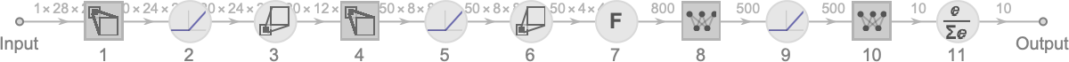 그렇다면 이것이 숫자 인식 네트워크에서 어떻게 더 자세하게 작동할까요? 우리는 네트워크가 11개의 연속적인 레이어로 구성되어 있다고 생각할 수 있으며, 다음과 같이 상징적으로 요약할 수 있습니다(활성화 기능이 별도의 레이어로 표시됨).