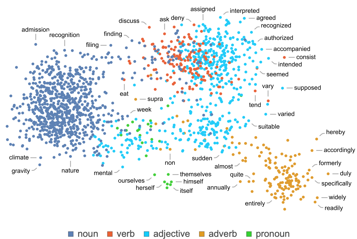 그렇다면 이 언어적 특징 공간은 어떤 것일까요? 다음은 이러한 기능 공간을 2D로 투영하는 경우 단일 단어(여기서는 일반 명사)가 어떻게 배치되는지에 대한 예입니다.