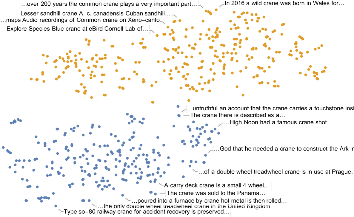 물론, 주어진 단어는 일반적으로 단지 "하나의 의미"를 갖지 않습니다(또는 반드시 품사의 한 부분에만 해당). 그리고 기능 공간에서 단어가 포함된 문장이 어떻게 배치되는지 살펴봄으로써 "기중기"(새 또는 기계?)라는 단어에 대한 예에서와 같이 종종 다른 의미를 "분리"할 수 있습니다.
