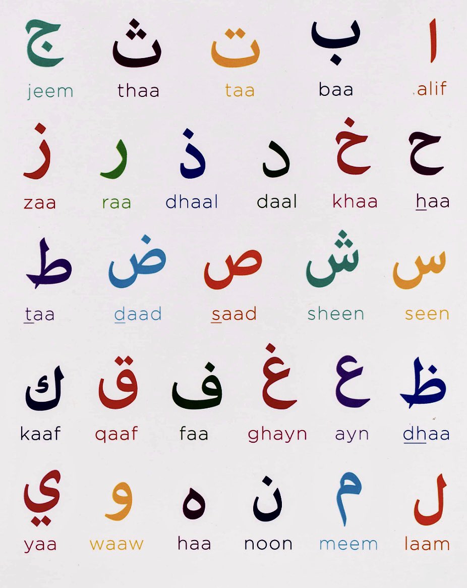 아랍어 알파벳은 분음 부호를 사용하여 28개의 음성 소리를 표현하는 18개의 모양으로 구성되어 있습니다. 같은 글자 모양이라도 점 하나를 아래에 놓으면 'b'(ب), 점 두 개를 위에 놓으면 't'(ت), 점 세 개를 위에 놓으면 'th'(ث) 소리를 낼 수 있습니다.