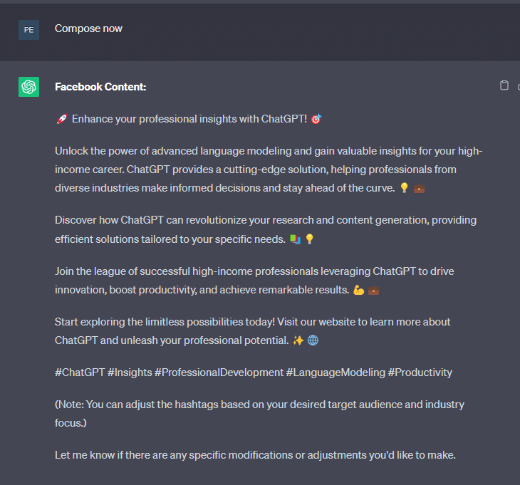 추천글과 이모티콘을 삭제하기로 결정한 다음 ChatGPT에 45개의 단어와 더 많은 해시태그를 추가해 달라고 요청했습니다. 이제 Facebook 그룹에 ChatGPT를 소개할 준비가 되었습니다.