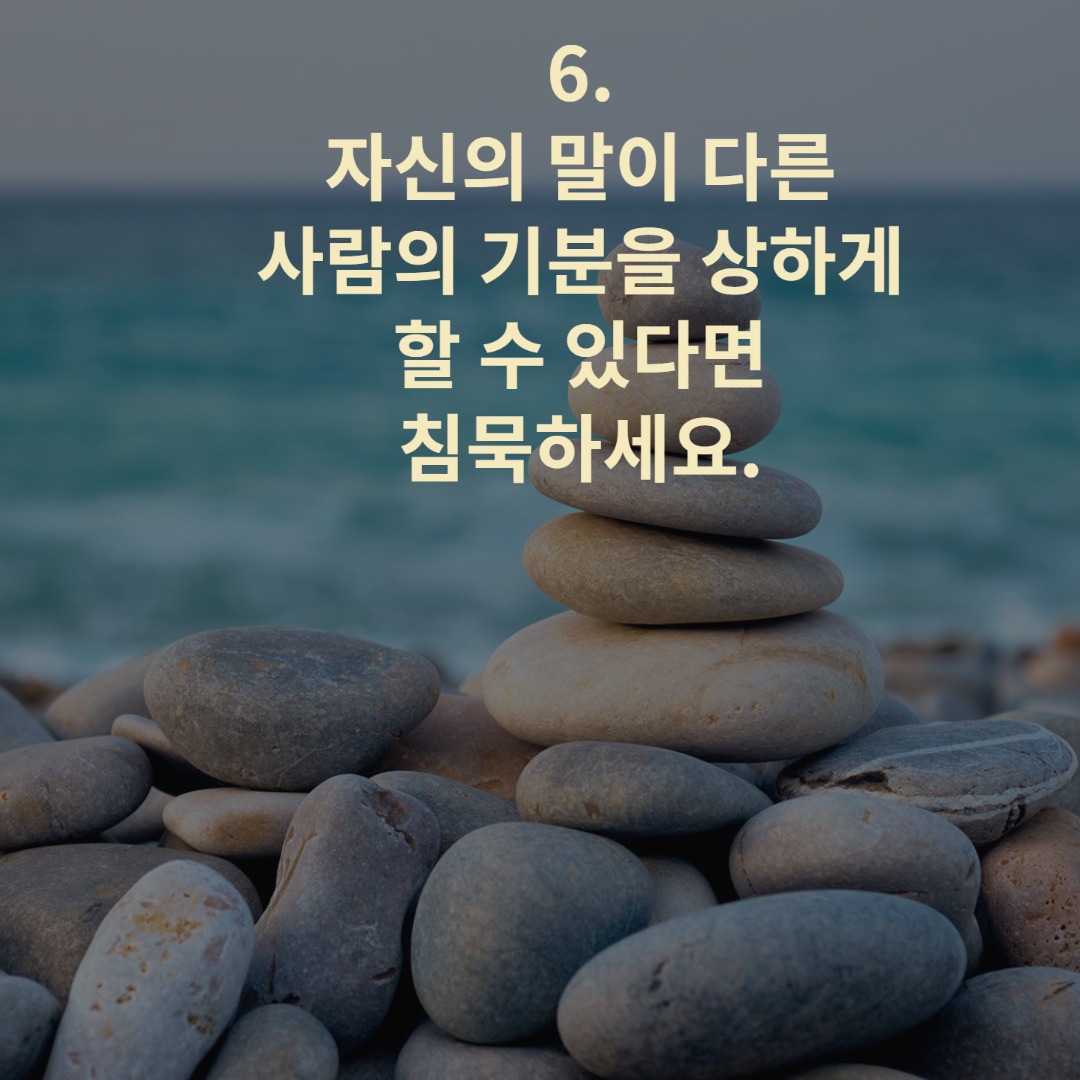 6. 자신의 말이 다른 사람의 기분을 상하게 할 수 있다면 침묵하세요. 배려와 친절함은 지능의 문제입니다. 침묵도 마찬가지입니다. 현명한 사람은 침묵합니다.