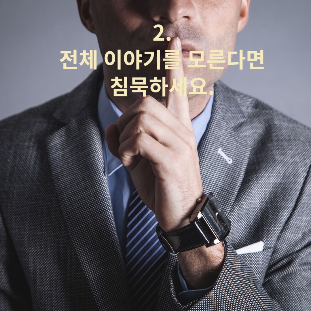 2. 전체 이야기를 모른다면 침묵하세요. 맥락을 모르는 상태라면 침묵을 유지하세요. 섣부른 판단이나 비난을 자제하세요. 대부분 당신이 받아들이지 못하는 상황은 없습니다. 침묵으로 정리가 될 때까지 기다려야 합니다.
