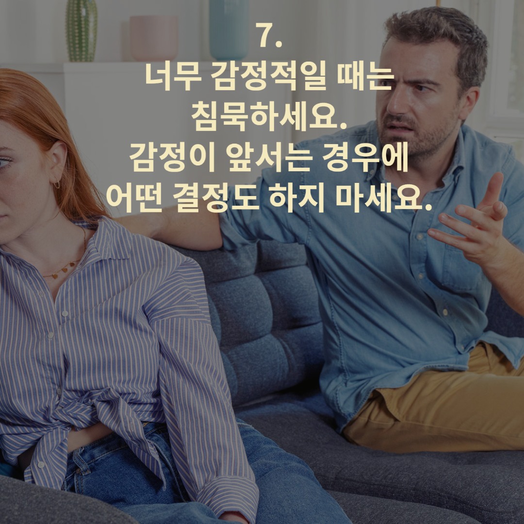 7. 너무 감정적일 때는 침묵하세요. 감정이 앞서는 경우에 어떤 결정도 하지 마세요. 이것은 슬플 때나 기쁠 때나 화났을 때 모두 해당됩니다. 우선 마음을 평온하게 하세요. 그 자리를 벗어나서 생각합니다.