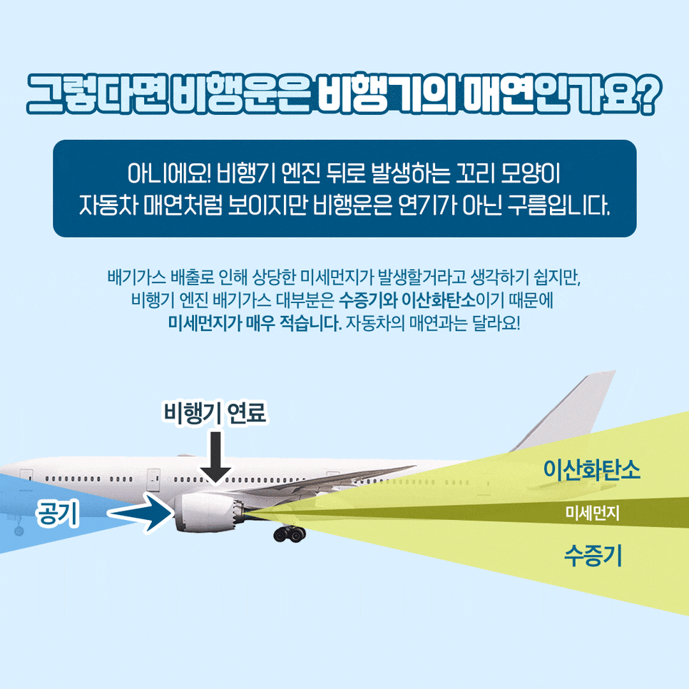 아니에요! 비행기 엔진 뒤로 발생하는 꼬리 모양이 자동차 매연처럼 보이지만 비행운은 연기가 아닌 구름입니다.