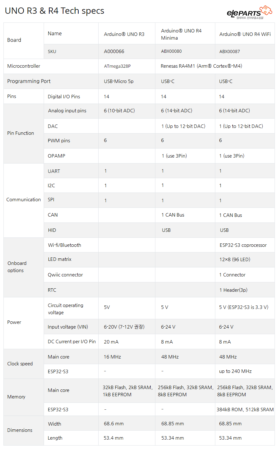 UNO R3와 R4의 차이점은 아래 표에서 간단히 비교해 보실 수 있습니다.(이미지는 엘레파츠 블로그)