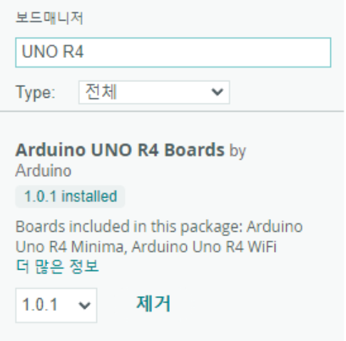 아두이노 IDE의 보드 매니저에서 UNO R4를 검색하기만 하면 바로 아두이노 UNO R4 보드를 추가할 수 있습니다.