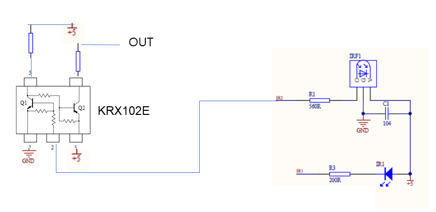 아래 회로도는 KRX102E(PNP/NPN 트랜지스터)을 사용한 회로도를 보여준다. 기능은 같다.