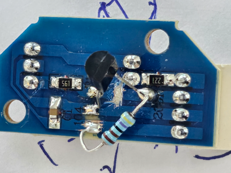 위 그림과 같이 2번 출력을 끊고 그 사이에 2N2222 트랜지스터를 연결하여 마무리한다. 저항은 4.7K를 사용했다. 작업 완료한 사진은 아래와 같다. 아래 참고 문서를 보면 어떻게 연결하는지 알 수 있다.