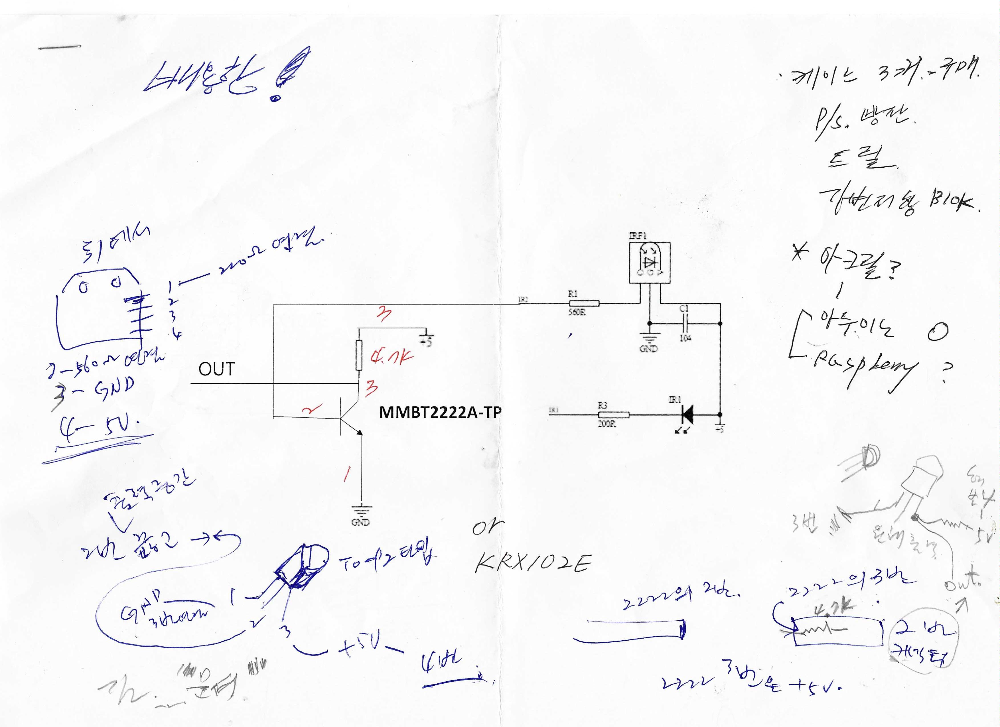 이전 IRF1 출력이 HIGH 라면 MMBT2222A 가 ON 상태로 작동하여 OUT은 LOW 신호가 출력되고, 이전 IRF1 출력이 LOW 상태면 MMBT2222A 가 OFF 기능을 해 OUT은 HIGH 신호가 출력된다. 오~ 정말 간단히 해결했는데 이거 부품 사다가 솔더 작업하고 두 개를 완성했다. 다음 주에 가져가서 시험하는 일이 남았다. 많이 베푼 사람이 나중에 몇 배로 다 받게 된다.