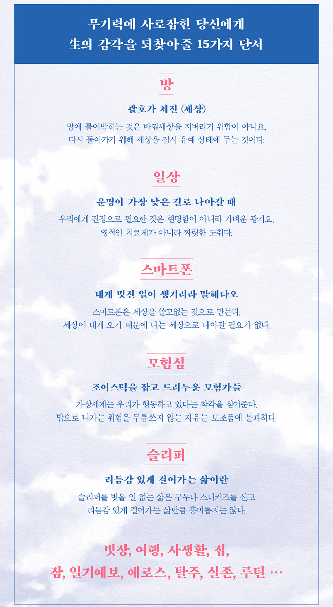 슬리퍼 차림의 영웅, 모험가, 특파원을 상상할 수 있는가? 슬리퍼를 벗을 일 없는 삶은 구두나 스니커즈를 신고 리듬감 있게 걸어가는 삶만큼 흥미롭지는 않다. 평소 흠모하던 대상, 가령 위대한 작가나 배우를 우연히 만났는데 그가 후줄근한 차림새에 슬리퍼를 질질 끌고 다니는 모습이었다면? 동경하던 대상의 범속함을 직시하게 되는 괴로운 경험이다. 그래서 헤겔이 남긴 유명한 말을 항상 되뇌게 된다. “자기 시종에게까지 영웅인 사람은 없다. 영웅이 진짜가 아니어서가 아니라 시종은 시종이기 때문에 어쩔 수 없다.” --- p.168, 「슬리퍼|리듬감 있게 걸어가는 삶이란」 중에서