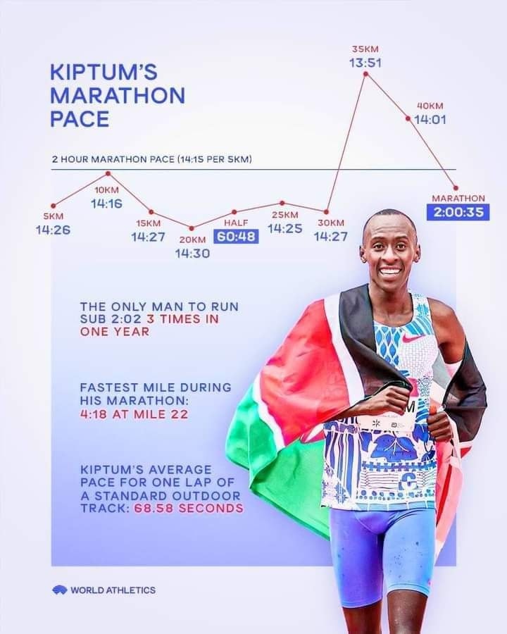 키프텀 - 2023 시카고 마라톤에서 풀코스 2시간 00분 35초의 세계 신기록 수립. 하프까지 1시간 48초, 오히려 하프 지난 후반에 시간을 줄였다는 것을 보여주는 페이스.