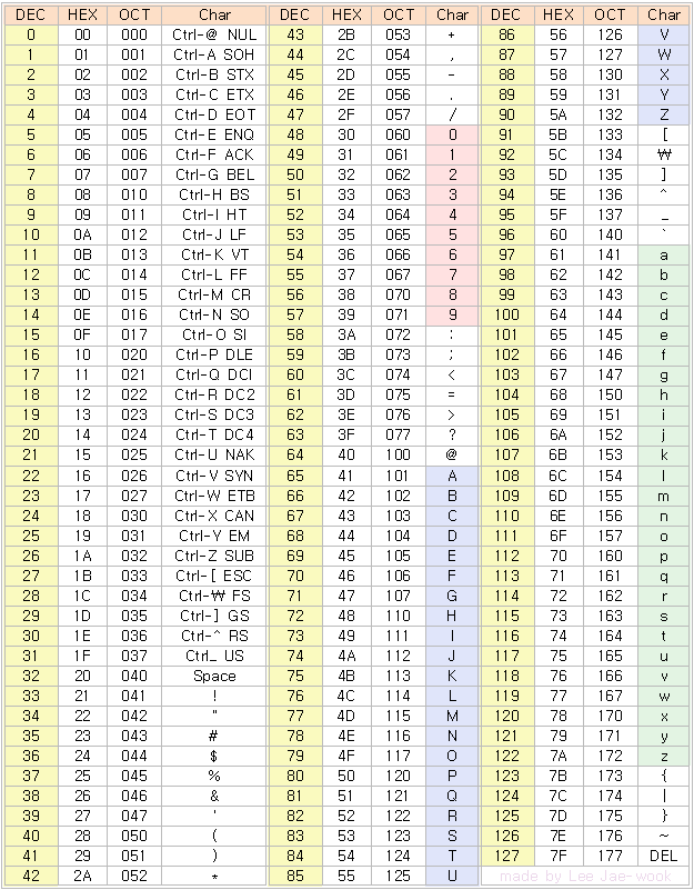 아래는 여러 형태의 아스키코드표입니다. Ctrl + F로 검색할 수 있도록 작성했습니다.
