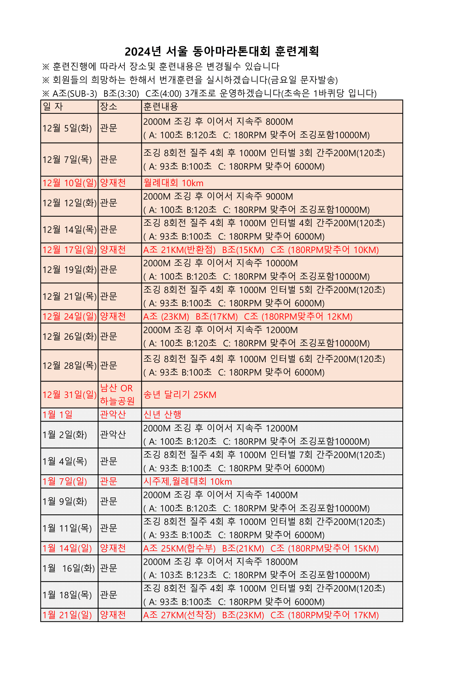 2024년 서울 마라톤(동아마라톤)을 준비하는 훈련을 시작한다. 성자재자에게 부탁해 훈련 일정표를 받았다. 시간은 흐르는 대로 흐르는데 달리면 일 년이 쏜살같이 흐른다. 메이저 대회인 서울마라톤과 춘천마라톤 대회 참가 3개월 전에 훈련을 시작하고, 중간에 고구려 마라톤, 서울 하프 마라톤, 공주 백제 마라톤 대회를 다녀오면 한 해의 마라톤 일정이 모두 끝난다.