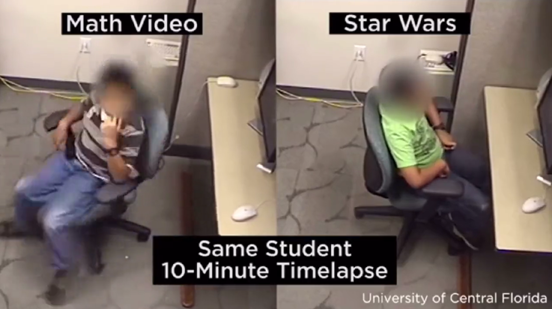 비디오: 이 타임랩스 비디오에서는 동일한 ADHD 아동이 수학 교육용 비디오와 스타워즈 클립을 시청하는 모습을 보여줍니다. 아이는 수학 비디오를 시청하는 동안에만 안절부절못하고 과도한 움직임을 보이며, 이는 실행적인 두뇌 기능을 필요로 합니다. 크레딧: 센트럴 플로리다 대학교 아동 학습 클리닉