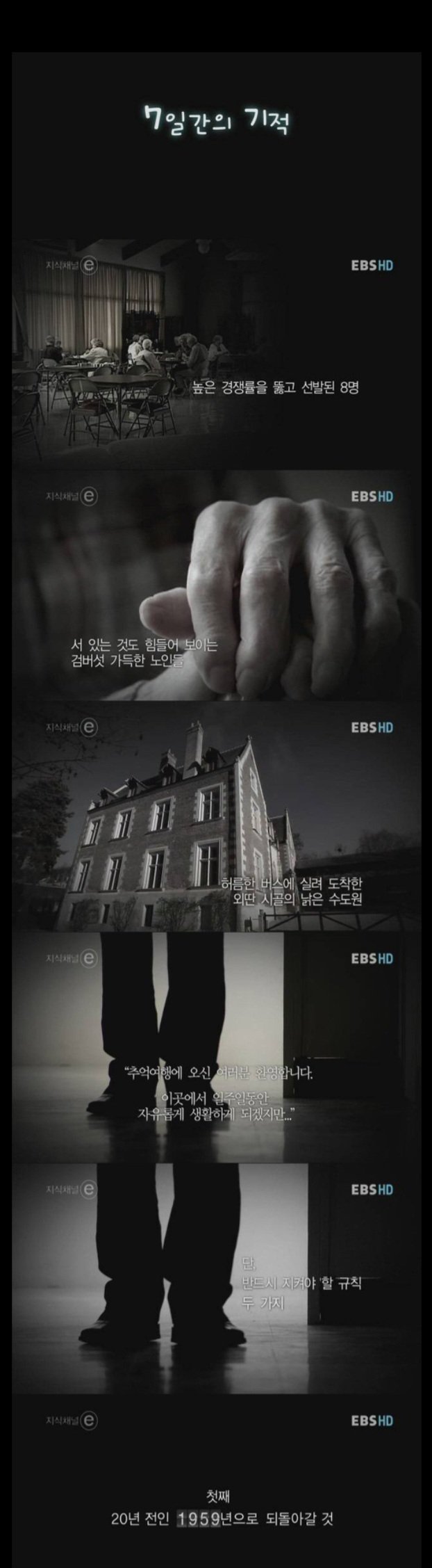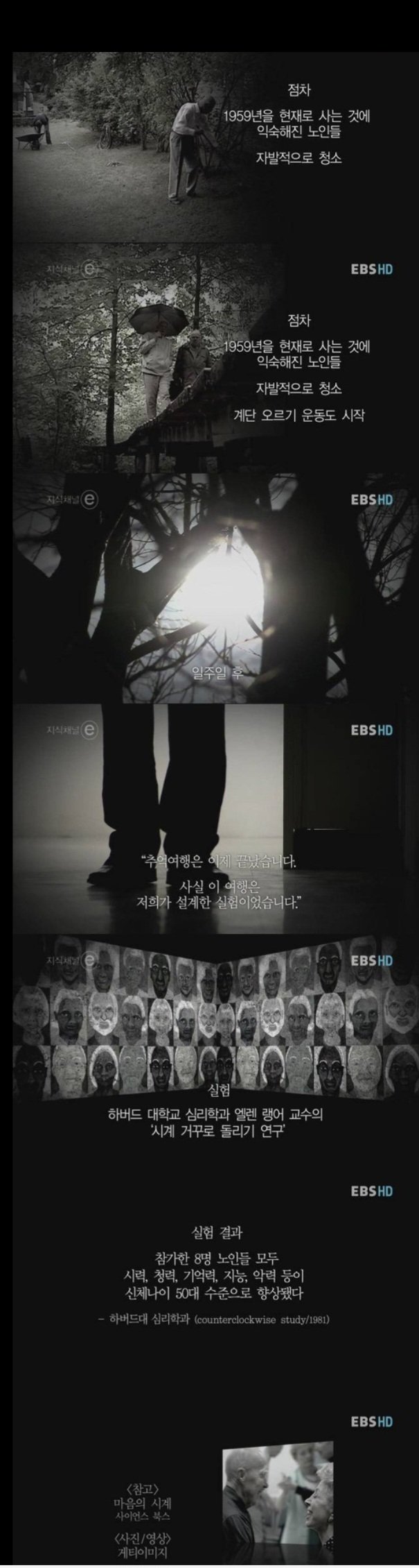 1. 80대 노인 8명 뽑아서 "여기는 1959년이고, 당신은 50대이며 올해 개봉된 영화인 메릴린먼로 주연 영화(실제 그때 개봉함)를 함께 보자. 올해 나온 음악을 같이 듣자."라고 설득합니다. 1959년도 신문을 매일아침 읽게 하며 시간여행(?) 실험합니다. 실제로 모든 주변 환경이 노인들의 젊은 시절인 1959년도와 똑같이 꾸며진 곳에서 살게 합니다.