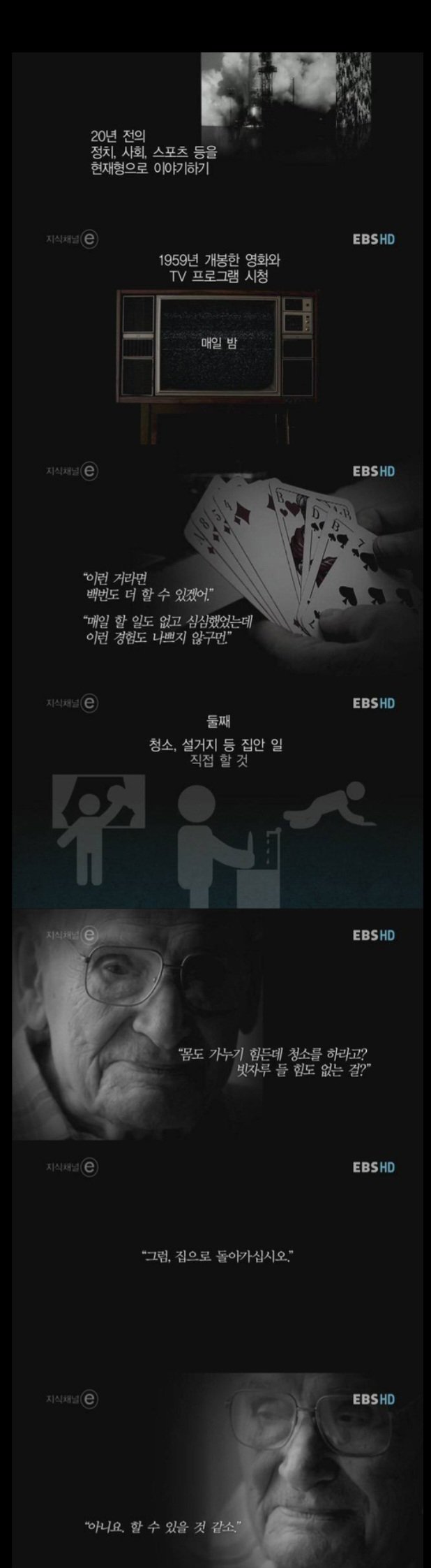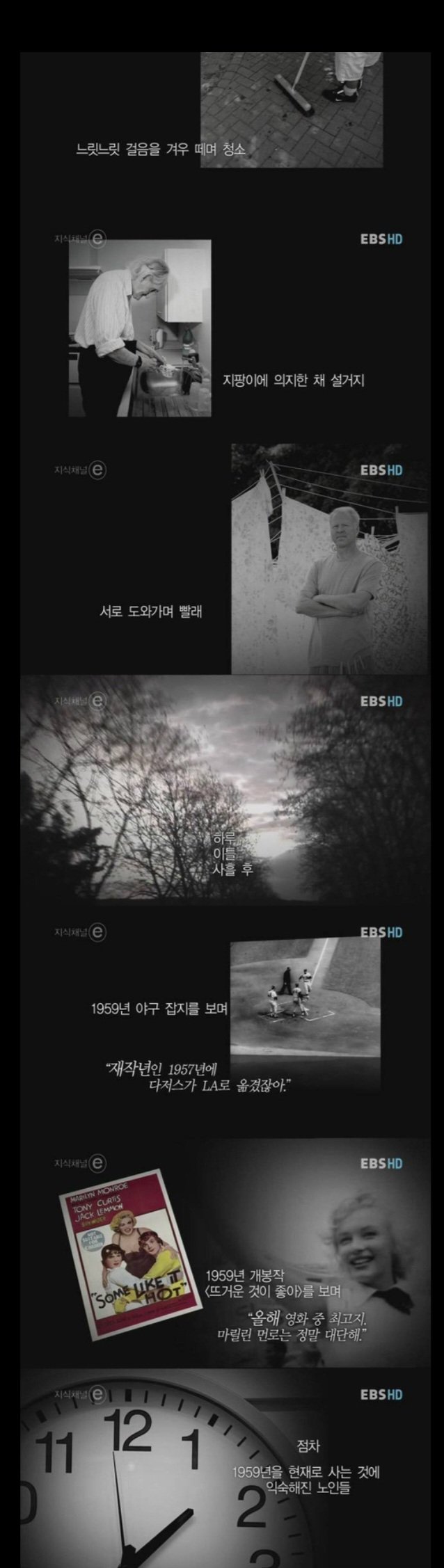 실제로 간병인 도움 없이는 거동이 불편한 노인도 있었죠. "당신들은 스스로 청소할 수 있을 만큼 충분히 젊다고, 지금은 1959년이다. 당신들은 젊다."라고 하면서 청소를 시키고, 계단을 오르고, 주변을 가꾸게 합니다. 처음에 마지못해 움직이던 노인들은 연구진이 유도하는 일을 나중에는 수월하게 잘하고 즐기는 모습을 보여줍니다..