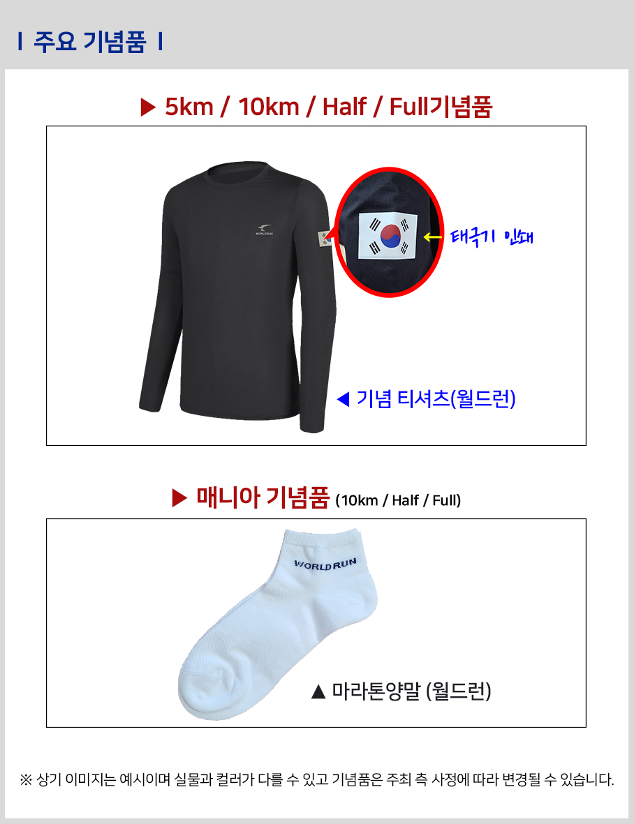 | 10Km | 45,000원 | 기념티셔츠(월드런), 완주메달, 웹-모바일기록증 | 2시간 | 칩사용 | |