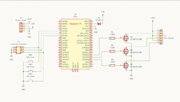PCB 하단에 있는 세 개의 출력 각각에 LED 조명을 연결하고 코드를 Pico에 업로드하기만 하면 됩니다.