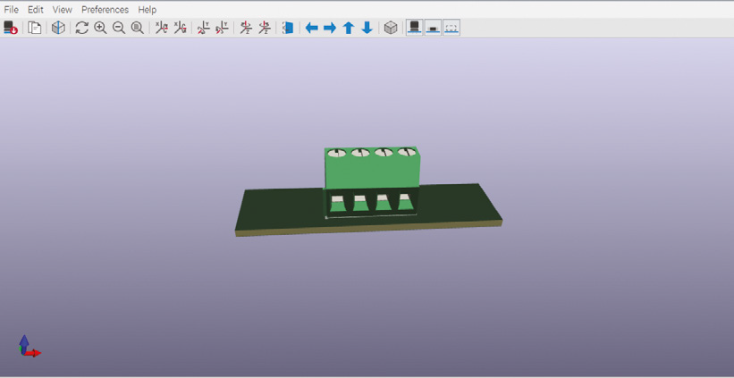 그런 다음 단자 나사 커넥터(전원 입력 및 LED 출력이라고 표시된)를 선택합니다. "터미널블록_피닉스"를 선택하고 풋프린트 필터에서 핀 수가 선택되어 있는지 확인합니다. 올바른 간격에 따라 적절한 터미널 블록을 선택합니다(예: 5mm는 TerminalBlock_Phoenix_MKDS-1,5-4_1x04_P5.00mm_Horizontal과 일치). 올바르게 보이는지 확인하려면 마우스 오른쪽 버튼을 클릭하고 선택한 풋프린트 보기를 사용하세요. 3D 패키지를 설치한 경우 뷰 상단의 3D 아이콘을 클릭하여 3D로 어떻게 보이는지 확인할 수도 있습니다. 그림 5를 참조하세요. 풋프린트를 두 번 클릭하여 회로 심벌과 연결합니다. 스위치 연결 블록의 경우 커넥터_핀헤더_2.54mm(브레드보드의 핀과 동일한 거리) 라이브러리를 사용하고 2x03 수직으로 된 것을 선택합니다.