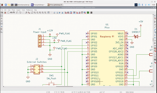 이전 튜토리얼의 회로도 다이어그램으로 시작하겠습니다. 다이어그램은 그림 1에 나와 있습니다. 회로가 설계되고 주석을 달았지만 인쇄 회로 기판으로 바꾸기 전에 몇 가지 변경이 필요합니다. 라즈베리파이 Pico 설명서(magpi.cc/hwdesignrp2040)에서는 Pico의 모든 접지를 접지에 연결할 것을 권장합니다. 이는 핀 3, 8, 13, 18, 23, 28, 38에 설정해야 합니다. 나머지 모든 핀은 배치 메뉴에서 연결 안 함 플래그 추가를 사용하여 연결되지 않음으로 설정해야 합니다.