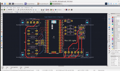 0.25mm 트랙 크기로 전환하고 나머지 트랙을 계속 배치합니다. KiCad는 필요한 연결(그물망이라고 함)을 가는 선으로 표시합니다. 라우팅을 더 쉽게 하기 위해 일부 구성 요소를 회전하는 것이 유용할 수 있습니다. 다른 트랙을 통과하지 않고 연결을 실행할 수 없는 경우 후면 구리 레이어 B.Cu로 전환할 수 있습니다. 앞쪽 레이어는 빨간색, 뒷쪽 레이어는 파란색으로 표시되어 쉽게 식별할 수 있습니다.