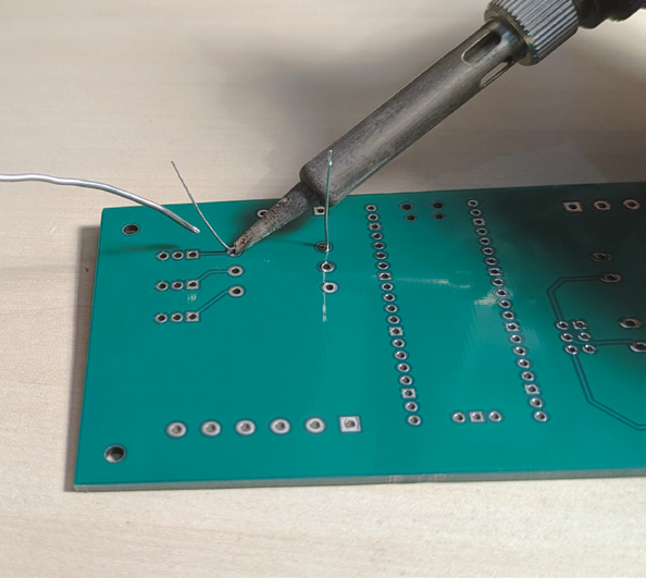 나열된 구성 요소는 모두 스루홀 구성 요소이므로 납땜이 매우 쉬울 것입니다. 최상의 결과를 얻으려면 납땜 인두를 잡고 PCB의 패드와 구성 요소의 리드에 모두 닿도록 하세요(그림 9 참조).