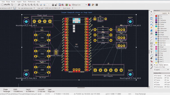 풋프린트를 선택한 후 회로도 디자이너 내에서 또는 프로젝트 창으로 돌아가서 실행할 수 있는 PCB 편집기를 실행합니다. 도구 메뉴에서 회로도에서 PCB 업데이트를 클릭하여 모든 컴포넌트 풋프린트를 가져옵니다. 컴포넌트가 임포트되지만 모두 서로 가깝게 배치됩니다. 각 컴포넌트를 개별적으로 선택하고 PCB에서 원하는 위치로 이동합니다. 스위치는 왼쪽에, 저항이 할당된 GPIO 핀 근처 오른쪽에 저항이 있는 MOSFET이 있어야 합니다. 일반적으로 PCB의 크기를 줄이기 위해 구성 요소를 서로 가깝게 배치하되 너무 가까워서 전선 라우팅을 어렵게 만들면 안 됩니다. 권장 레이아웃은 그림 6에 나와 있습니다.