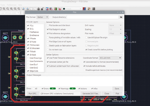 KiCAD의 마지막 단계는 PCB를 내보내 제조업체로 보내는 것입니다. 정확한 프로세스는 PCB 제조업체에 따라 다르며, 여기에 사용된 예는 JLCPCB용이며 프로세스는 magpi.cc/jlcpcbprocess에 설명되어 있습니다. 제작 출력 및 거버를 선택합니다. 출력 디렉터리를 picolights-gerbers로 설정합니다. Protel 파일명 확장자를 선택하고 실크스크린에서 솔더마스크 빼기를 선택합니다(이렇게 하면 디자인 규칙 검사기의 일부 경고가 수정됩니다). 그런 다음 플롯을 클릭합니다. 그림 8을 참조하세요.