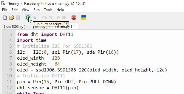 실행 버튼을 클릭하면 SSD1306 OLED 디스플레이 모듈의 온도와 습도를 확인할 수 있습니다.