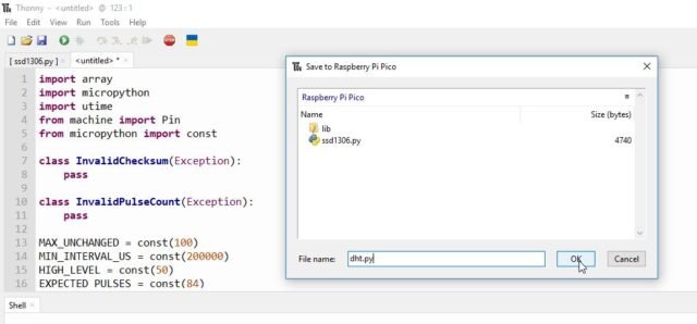 이 프로젝트를 실행하려면 Thonny IDE 또는 원하는 다른 IDE가 설치되어 있는지 확인하세요. 이 프로젝트에서는 세 가지 스크립트, 즉 ssd1306.py, dht.py 및 main.py를 사용합니다. ssd1306.py 파일은 이전 글에서 설명한 SSD1306 OLED 디스플레이 모듈의 드라이버 코드에 사용됩니다. dht.py 파일에는 DHT11 온도 및 습도 센서에 대한 라이브러리 코드가 포함됩니다. 아시다시피 DHT11 온도 및 습도 센서는 라이브러리 없이는 작동하지 않습니다. 마지막으로, main.py 파일에서 SSD1306 OLED 디스플레이 모듈에 온도와 습도를 표시할 프로젝트의 실제 코드를 작성합니다.