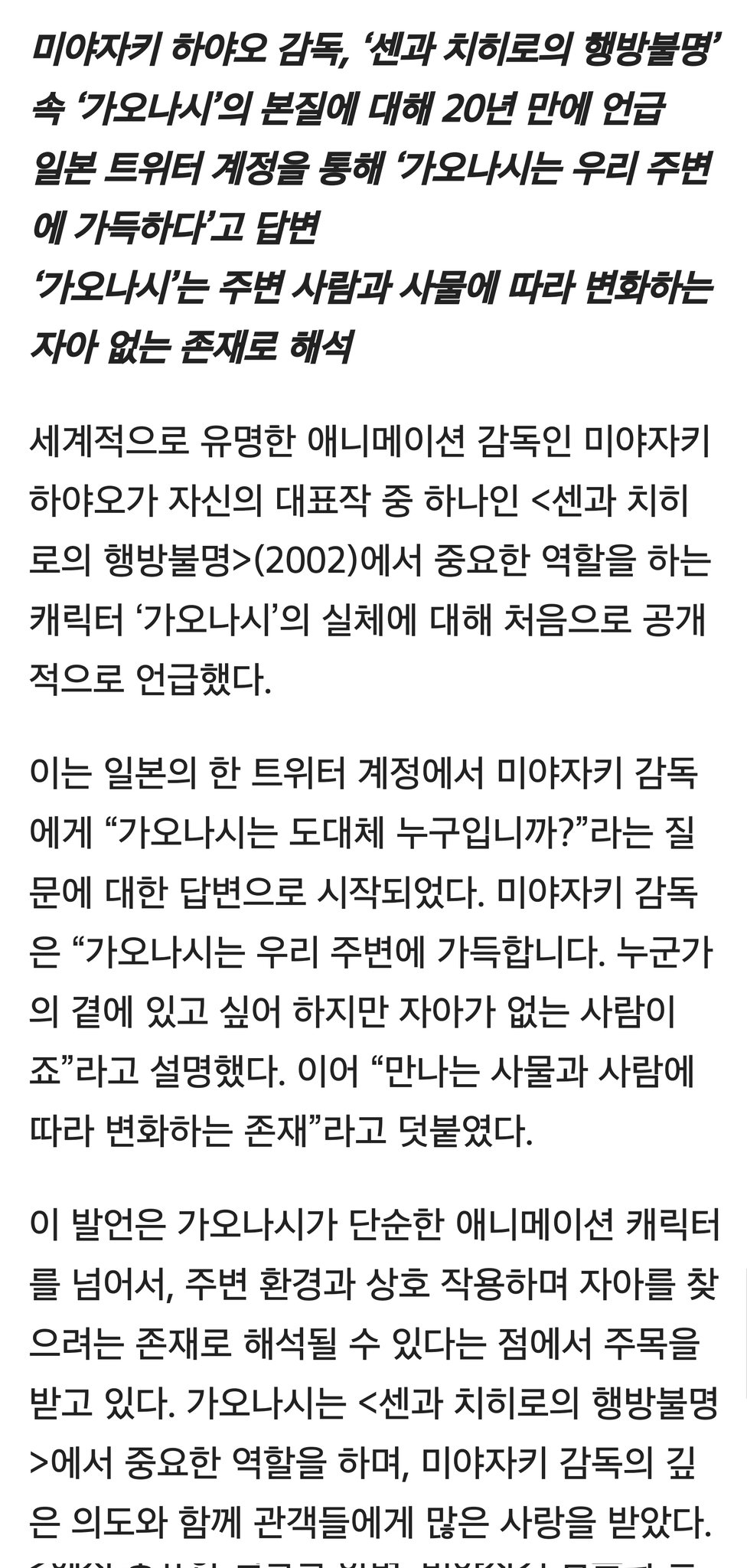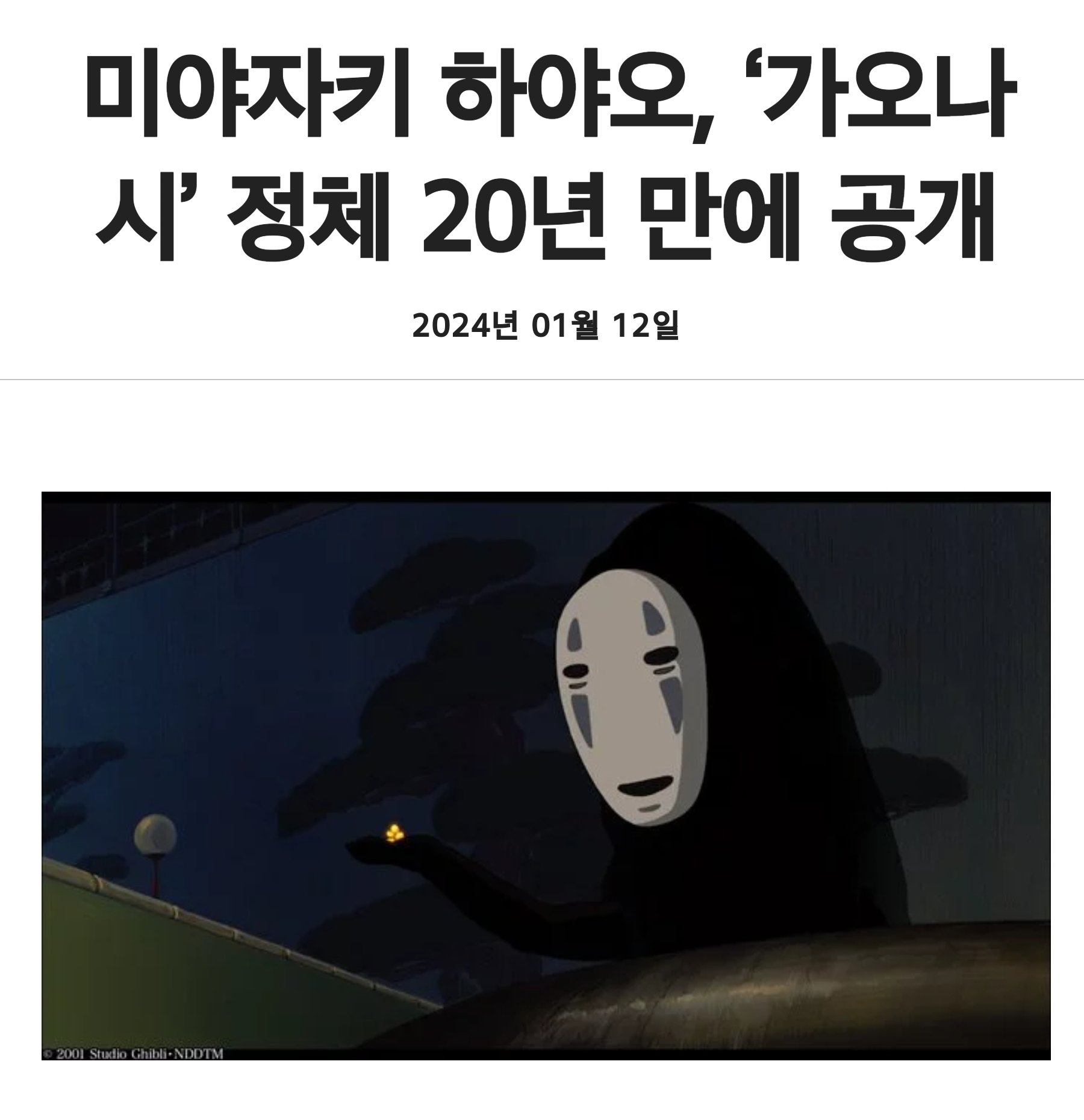 미야자키 하야오, ‘가오나시’ 정체 20년 만에 공개