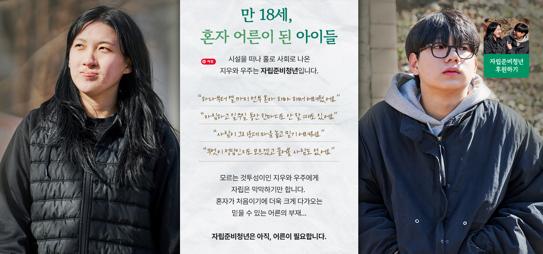 자립준비 청년 후원을 광고하는 유튜브 영상을 봤다. 만 18세라서 시설을 떠나 사회로 나온 자립 1년 차 우주라는 아이와 자립 3년 차 지우가 나온다. 어디서 도움을 받을 수도 없고 일주일 동안 단 한마디의 말도 없이 지내고, '잘 지내니?'라는 말이 가장 힘이 되는 아이들에게 아직은 어른이 필요하다고 한다.