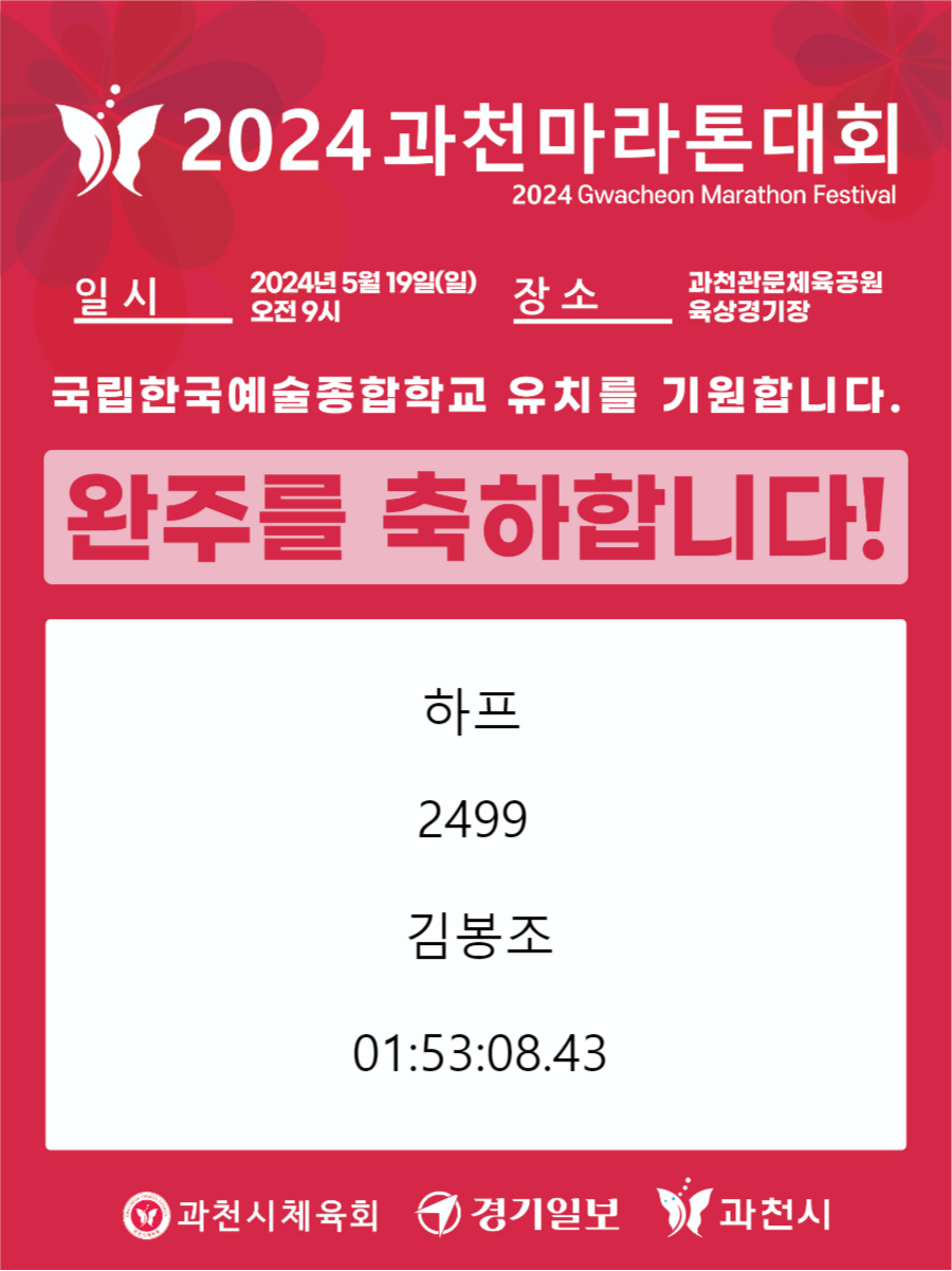 | 2024 과천마라톤 하프 완주 1시간 53분 8초 (1) | 2024.05.22 |