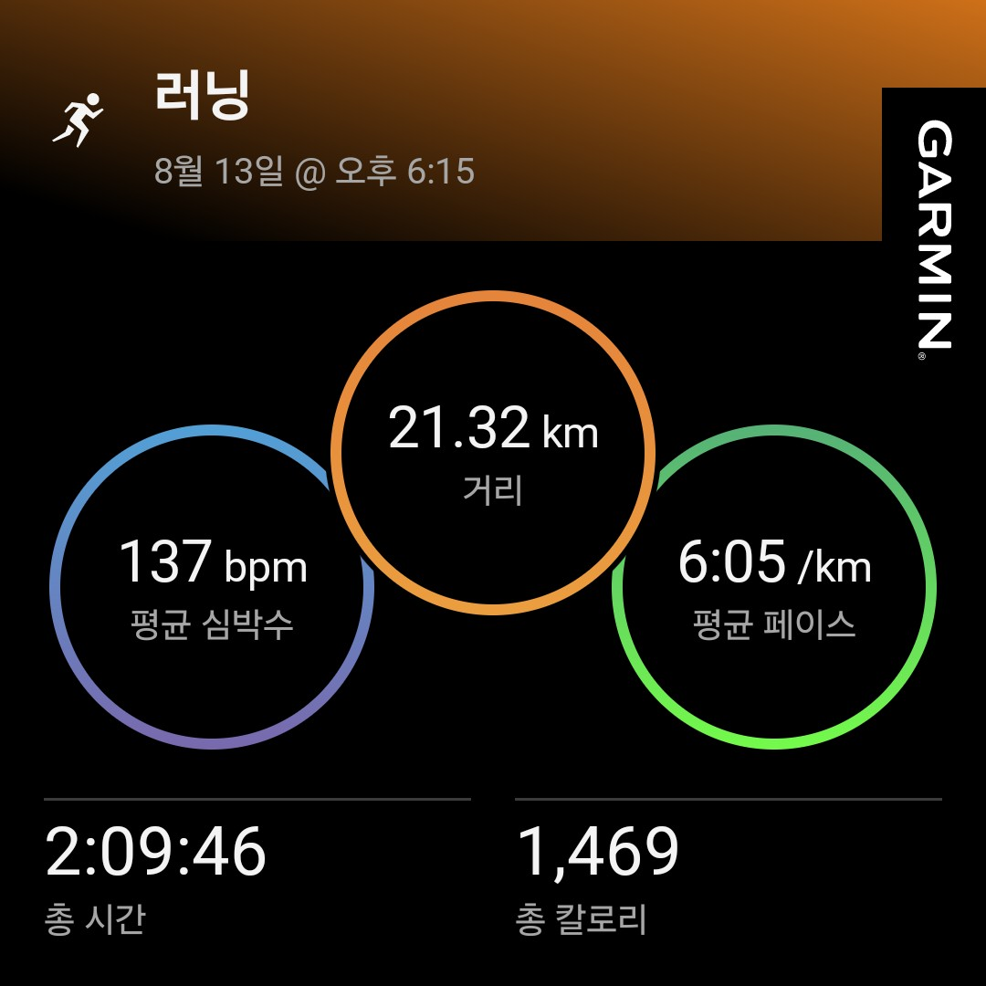 8월 13일 화요일 우중주, 21.32km, pace 6:05