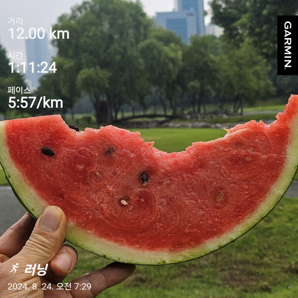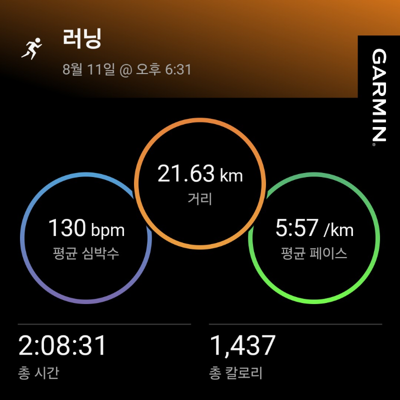 8월 6일 화요일 훈련. 21.6km, 2시간 11분 55초, pace 6:00