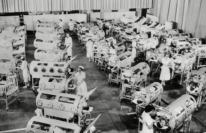이 장치는 인공 호흡기 역할을 하는 커다란 수평 실린더로, 호흡 과정을 모방하여 작동합니다. 먼저 수동 또는 모터로 작동하는 에어 펌프로 공기를 상자 밖으로 빨아들입니다. 이렇게 하면 진공 상태가 만들어져 환자의 폐가 확장되고 공기가 흡입됩니다. 그런 다음 공기를 다시 상자로 들여보내 내부 압력을 높여 환자의 폐를 수축시켜 공기를 배출합니다. 1950년대에 출시된 최초의 소아마비 백신은 미국의 바이러스학자인 조나스 솔크에 의해 개발되었습니다. 그 후 1988년부터 소아마비 발병률을 영구적으로 0으로 만들기 위해 전 세계적으로 소아마비 퇴치를 위한 이니셔티브가 추진되었습니다.