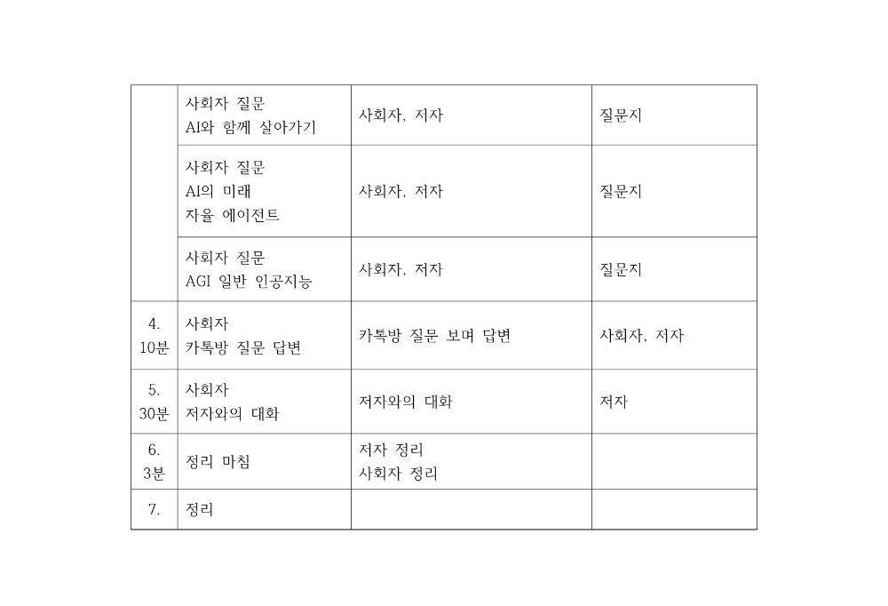 책 구입에 대한 감사와 인공지능 리터러시를 갖추기 위한 행사를 동호회 회원 대상으로 북톤서트를 열기로 했다. 가볍고 즐거운 행사라서 엄청 중요하거나 잘해야 하는 행사는 아니지만 우리는 사자와 같아서 모든 사냥에 최선을 다한다. 아래에 북콘서트 프로그램과 시간, 준비 사항을 짰다. 모든 일엔 계획이 필요한 법이다. 계획에 들어 있지 않은 행동은 가급적 하지 않는다. 계획에 없던 일은 즐거움을 주기도 하지만 대부분 에너지를 낭비하는 필요없는 일을 만든다. 결과적으로 인생을 낭비하게 된다. 그 후론 계획에 들어 있는 일만 하는 게 더 좋다. 단순함을 지향하는 것은 삶의 기본적인 자세라고 생각한다.