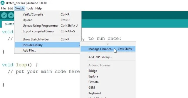 ESP32 BLE(Bluetooth 저에너지) 라이브러리를 설치하려면 먼저 아두이노 IDE에서 '스케치'를 클릭합니다. 그런 다음 드롭다운 메뉴에서 '라이브러리 포함'을 선택하고 마지막으로 '라이브러리 관리...'를 선택합니다.