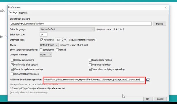 Arduino IDE의 ESP32 보드 패키지: Arduino IDE에 ESP32 보드를 추가합니다. IDE의 환경 설정에 다음 ESP32 보드 관리자 URL을 포함하면 됩니다.