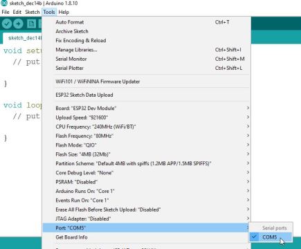Arduino IDE에서 적절한 ESP32 보드를 선택하려면 먼저 '도구'를 클릭한 다음 '보드' 위로 마우스를 가져간 다음 하위 메뉴에서 'ESP32 개발 모듈'을 선택합니다.