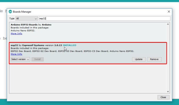 보드 관리자 창의 검색창에 'esp32'를 입력합니다. ESP32 패키지가 나열됩니다. 클릭하여 설치하기만 하면 됩니다. 제 경우에는 이미 설치되어 있습니다.