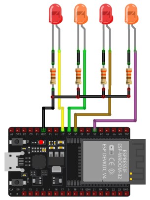 - pinMode(ledPin1, OUTPUT); 에 핀모드(ledPin4, OUTPUT); LED에 연결된 GPIO 핀을 출력으로 설정합니다. 이렇게 하면 ESP32가 이 핀을 HIGH 또는 LOW로 설정하여 LED를 제어할 수 있습니다.