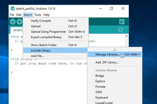 IDE가 열리면 라이브러리 관리자에 액세스할 수 있습니다. 이 작업은 IDE 상단의 메뉴 표시줄로 이동하여 스케치를 선택한 다음 라이브러리 포함을 선택하고 마지막으로 라이브러리 관리를 클릭하면 수행됩니다.