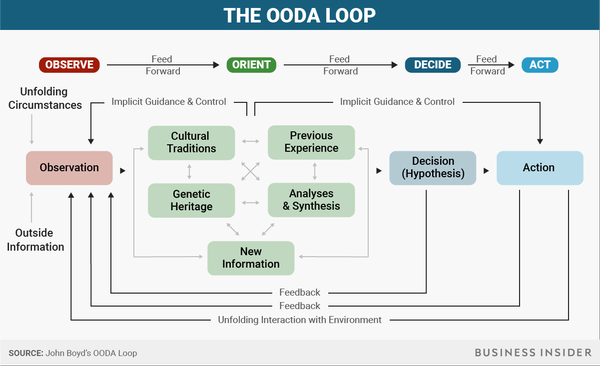전투기 조종사는 전투의 긴박감 속에서 훌륭한 결정을 내리기 위해 OODA 루프 프레임워크를 사용합니다.