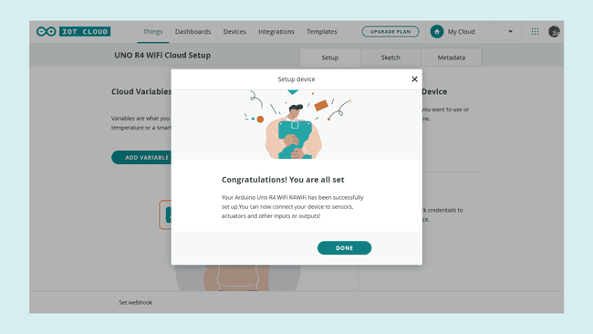 팝업의 단계를 완료하면 이제 IoT 클라우드에서 보드를 사용할 수 있다는 메시지가 표시됩니다.