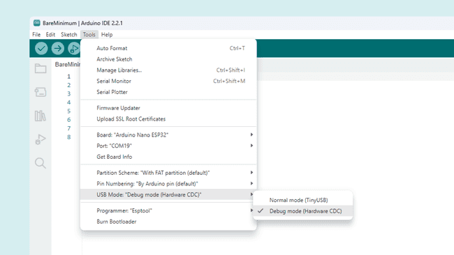 - Tools > USB Mode > Debug mode (Hardware CDC)