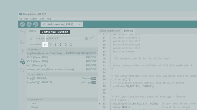 디버깅 세션을 시작한 후에는 기본 스케치와 설정한 중단점에 도달할 때까지 계속 버튼을 여러 번 눌러야 합니다. 이는 복구 시스템의 작동 방식과 예상되는 동작 때문입니다.