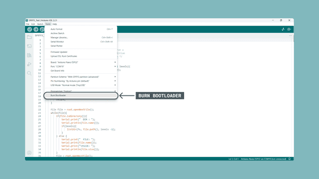 참고: Nano ESP에서 SPIFFS 파일 시스템 설정을 진행하기 전에 패키지 기본 제공 예제의 코드 주석에 언급된 마운팅 지침은 IDE 1.8과 같은 특정 이전 IDE 버전에 맞게 조정되어 있다는 점에 유의하시기 바랍니다. IDE 2.0은 사용자 지정 도구 사용을 지원하지 않으므로 이러한 지침은 이 경우 불필요할 수 있습니다.